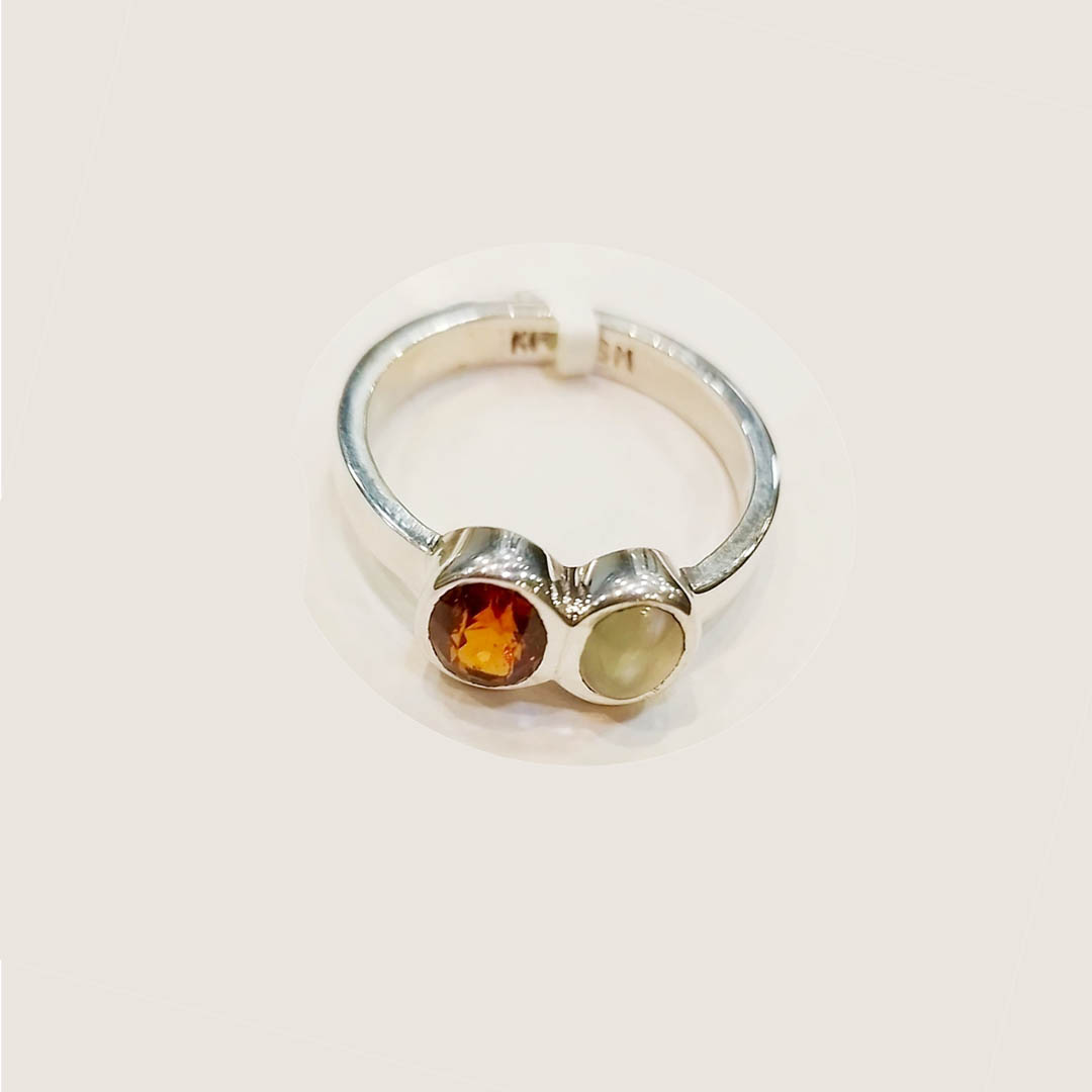A silver ring combining Catseye (Ketu) and Gomed/Hessonite (Rahu), for protection from sudden negativity and enhanced career growth. Typically designed in 92.5 sterling silver and with open setting the stones are worn together to mitigate the 6/12 house positions in a horoscope.